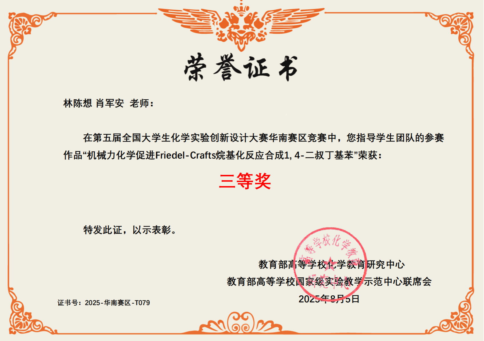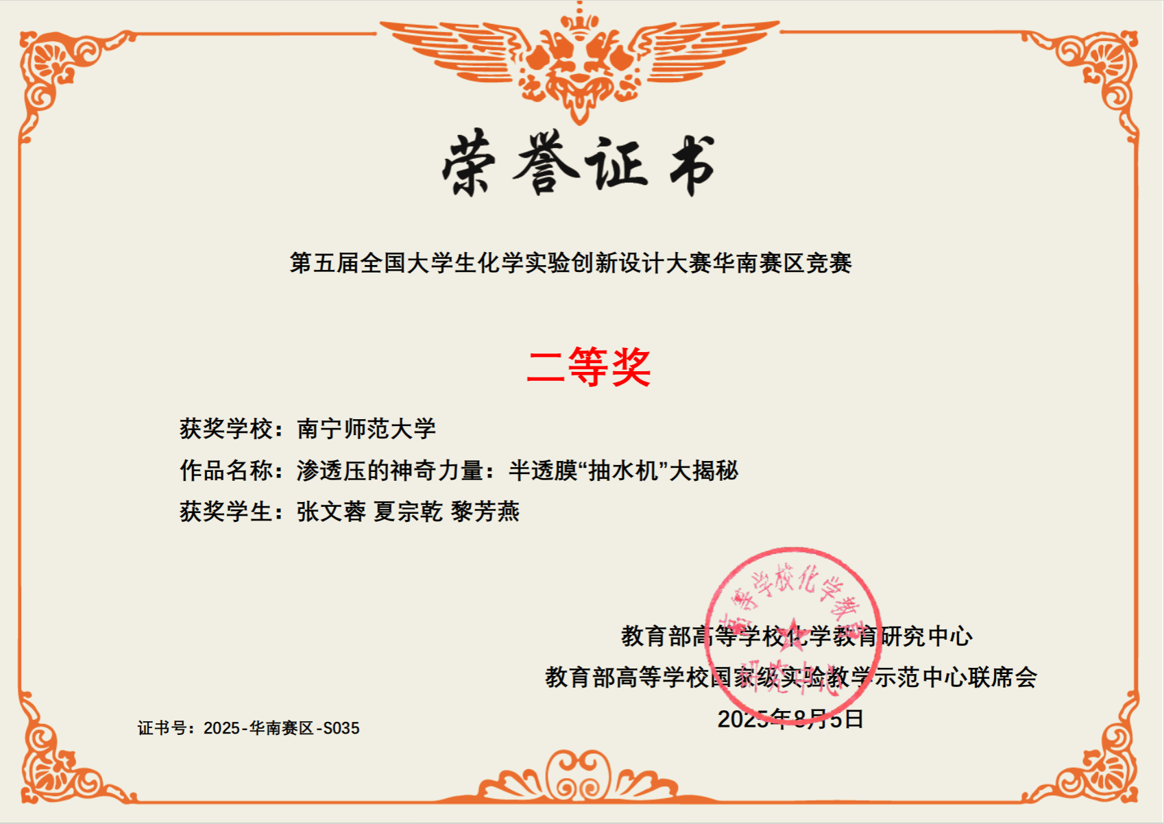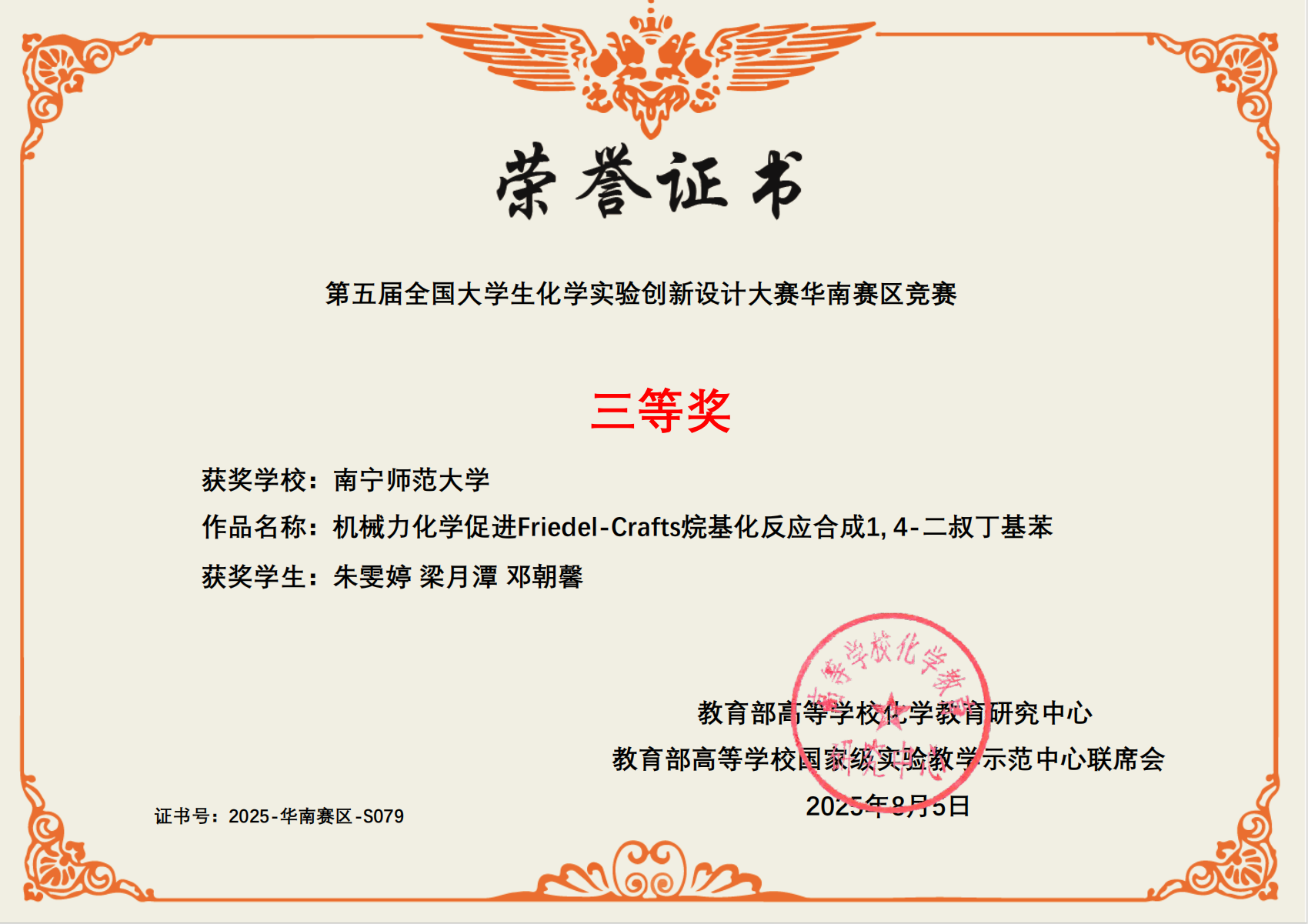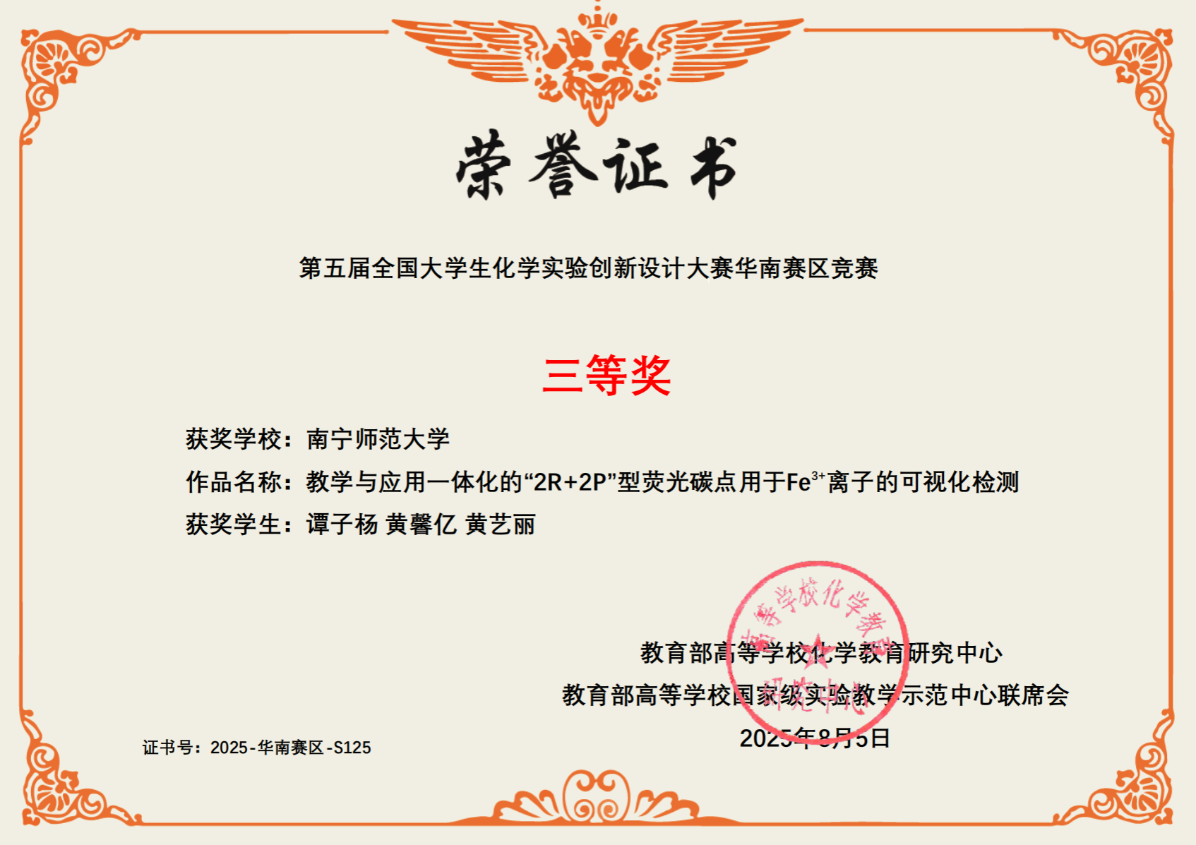 2025年7月25日至7月27日,在桂林举行的第五届全国大学生化学实验创新设计大赛华南赛区比赛中, 91av