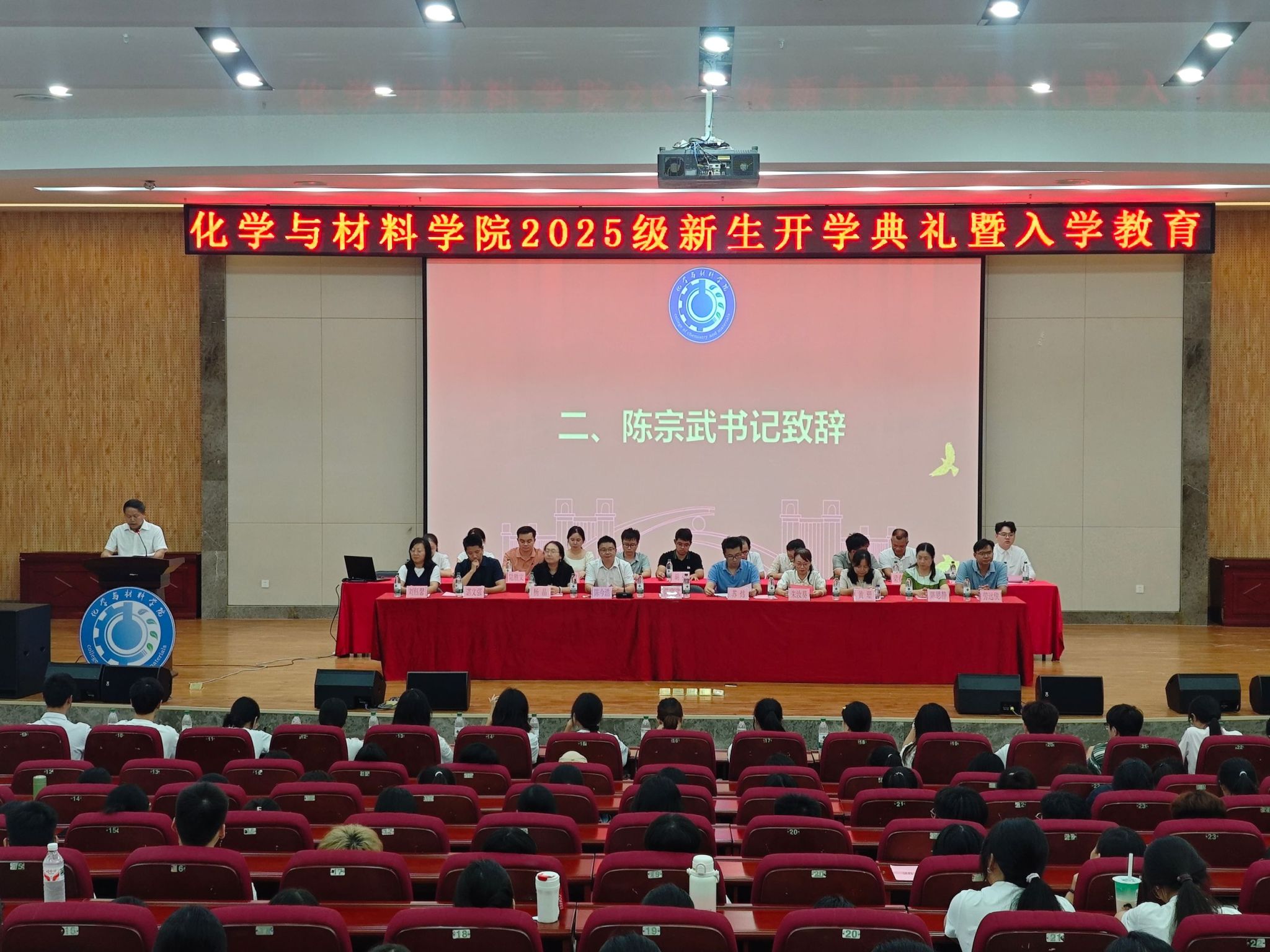 于9月9日在武鸣校区图书馆报告厅开展2025级新生开学典礼暨新生入学教育活动。学院党委陈宗武书记、苏炜院长、党委陈今浩副书记、朱汝葵副院长、杨晶副院长、院长助理、专业负责人、班主任、辅导员以及25级全体新生参加。活动由学院辅导员刘杨老师主持。