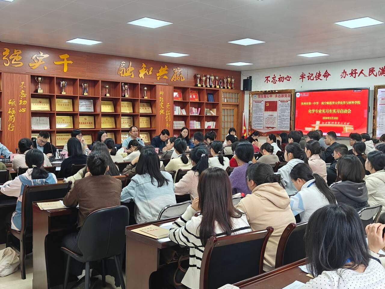 2023级化学专业师范生整装待发,奔赴南宁市第二十六中学、钦州市第一中学、贵港市高级中学等7所中学,开启为期数月的教育实习工作。党委苏学权副书记(主持党委工作)、苏炜院长、朱汝葵副院长、陈今浩副书记等领导为即将奔赴基层教育一线的学子们送行。