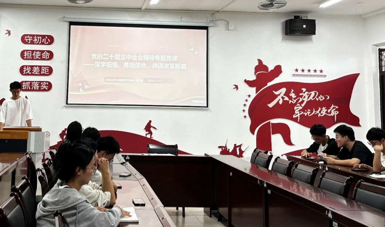 研究生第一党支部于地化楼B228会议室组织全体党员集体学习宣传贯彻党的二十届三中全会精神,本次集体学习由党支部副书记叶知益同志主持,党支部全体党员参加学习。
