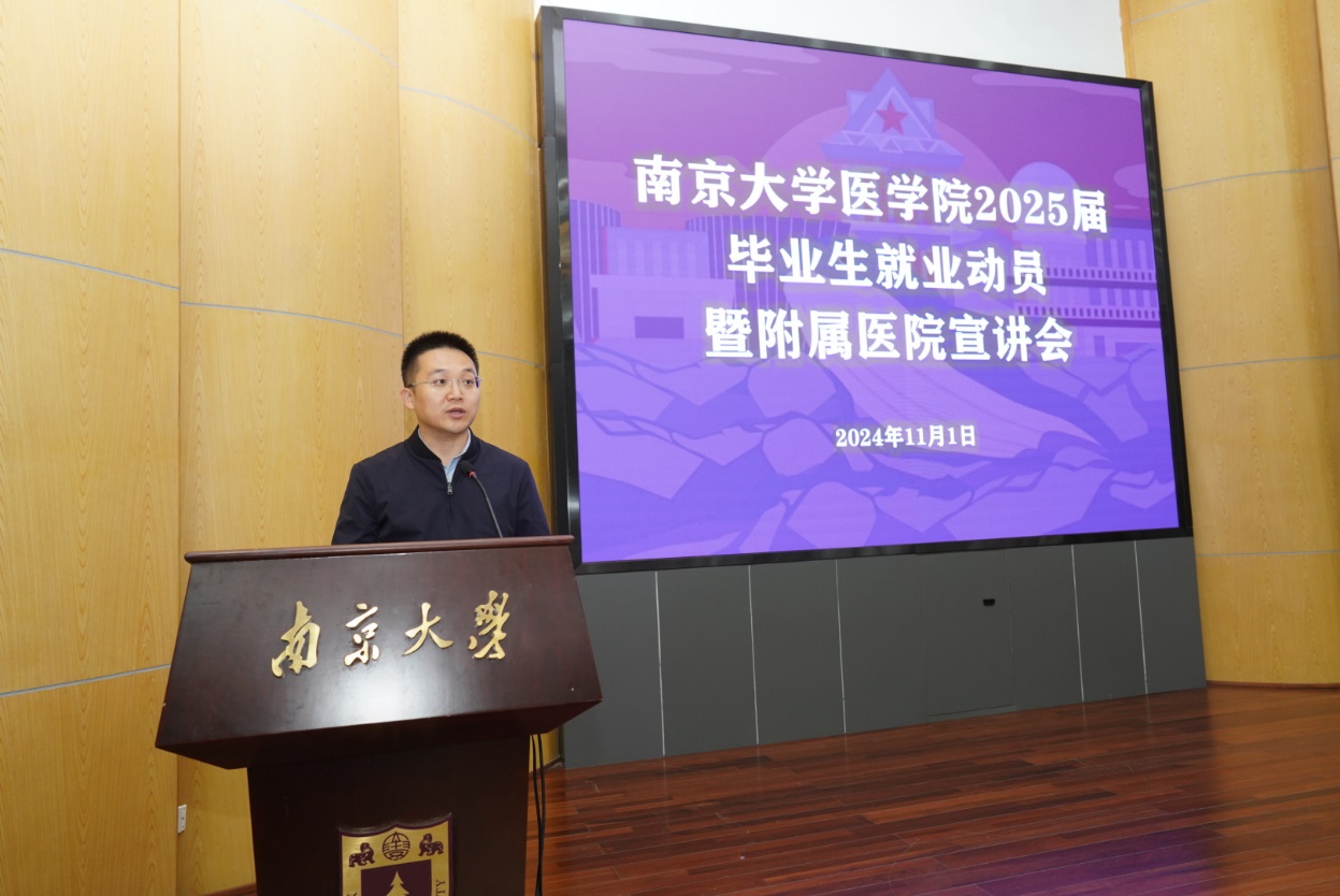 111日下午,2025届毕业生就业动员会暨附属医院专场宣讲会在鼓楼校区逸夫馆报告厅举行,唐健、沈苏南以及各附属医院代表出席会议。会议由王阿妮主持。