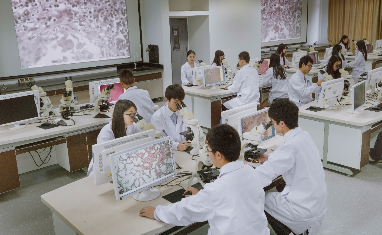 显微互动微观形态学实验室,主要为组织学和胚胎学以及病理学实验课而建设,帮助学生构筑微观形态学知识架构。除了可以采集显微镜下的图像,利用显示器进行观察外,还可以借助网络,实现师生的互动。2023年对该实验室进一步进行了软硬件升级改造,配有与显微镜适配的高清摄像头,使学生们能更好地观察器官、组织的微观结构,易于发现问题并解决问题,大大提高了学生的学习效率和自主学习兴趣。在教师指导下,学生利用显微互动系统、多媒体、标本、模型等独立观察、分析判断组织切片的微细结构和标本、模型的结构,借以验证、巩固和深化所学的理论知识。