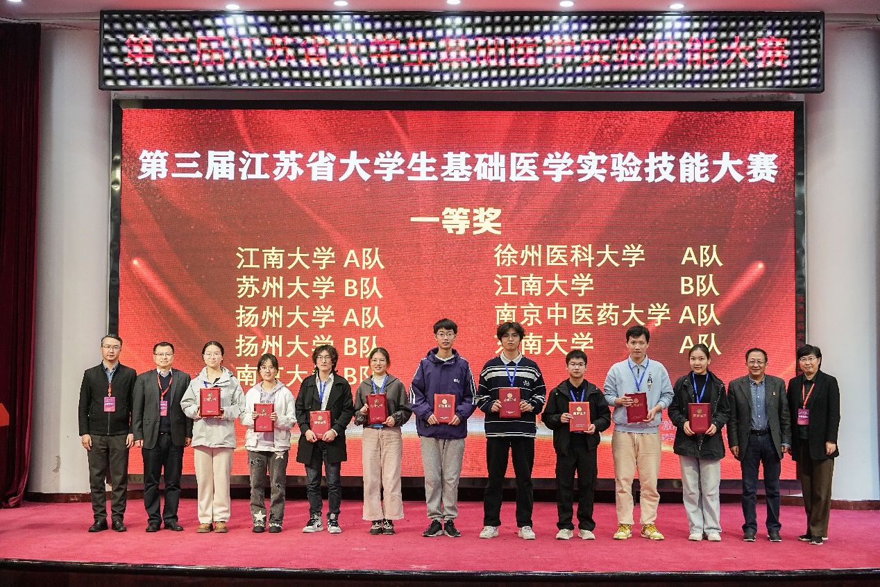 11 月 17 日,第三届江苏省大学生基础医学实验技能大赛于徐州圆满落幕。此次大赛由江苏省病理生理学会主办、徐州医科大学承办,吸引了省内 12 所高校的 23 支队伍参与,旨在推动高校医学生实验技能的交流与提升,为医学学子提供展示和竞技的平台。南京大学医学院积极响应,选派两支队伍参赛,凭借扎实的专业知识与出色的实验技能,在激烈角逐中脱颖而出,荣获团体一等奖和二等奖,彰显了南京大学医学院在基础医学实验教学方面的强劲实力。
