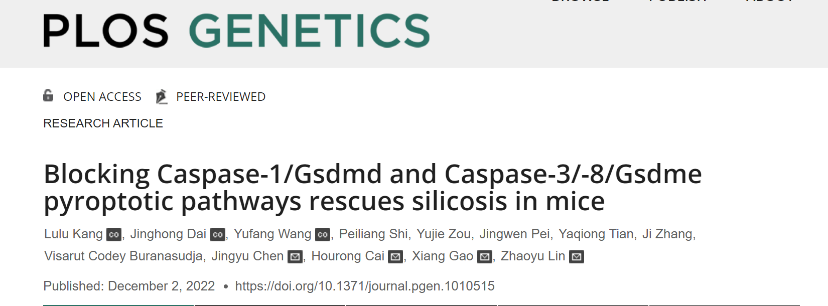2022年12月2日,南京大学医学院林兆宇和高翔课题组、南京大学医学院附属鼓楼医院蔡后荣与无锡市人民医院陈静瑜合作在《PLOS Genetics》上在线发表题为“Blocking Caspase-1/Gsdmd and Caspase-3/-8/Gsdme pyroptotic pathways rescues silicosis in mice” 的研究论文。这项工作发现了二氧化硅诱导的细胞裂解死亡和肺部炎症同时依赖于Gsdmd和Gsdme两条细胞焦亡通路;文章还剖析了在二氧化硅诱导的焦亡中上游的Caspases激活和下游的细胞因子释放,并找到了治疗矽肺病的潜在新疗法。南京大学医学院林兆宇副教授、高翔教授、南京大学医学院附属鼓楼医院蔡后荣主任、无锡市人民医院陈静瑜主任是本论文的共同通讯作者;南京大学医学院康路路、王雨芳以及南京大学医学院附属鼓楼医院为共同第一作者。本研究得到了国家自然科学基金委、科技部、教育部、江苏省科技厅以及中央高校等基金的支持,同时也得到合作实验室的大力协助与支持。