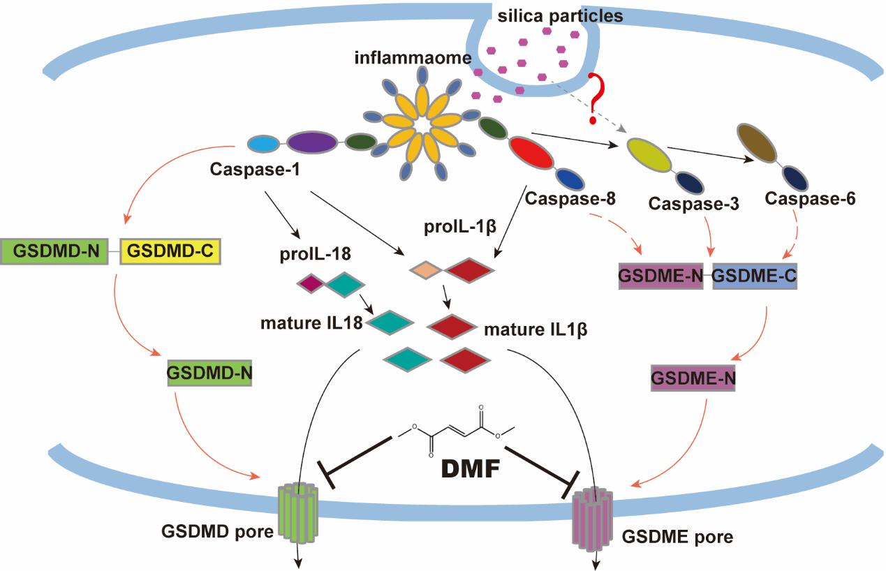 由于相关的Caspases不仅介导了Gsdmd和Gsdme的裂解,而且还介导了细胞因子的成熟和释放。抑制这些Caspases可能是治疗矽肺的方法之一。研究人员设计了体内试验来研究Caspase抑制剂对矽肺的治疗效果。给小鼠吸入二氧化硅颗粒的同时进行腹腔注射对照溶剂或Caspase抑制剂。腹腔注射z-VAD-FMK或Caspase-1/-3/-8抑制剂阻断了焦亡标志物和细胞因子的激活。DMF作为一种FDA批准的药物,可以抑制GSDMD和GSDME的切割。最后,研究人员在小鼠模型中发现DMF对矽肺也有明显的保护作用。