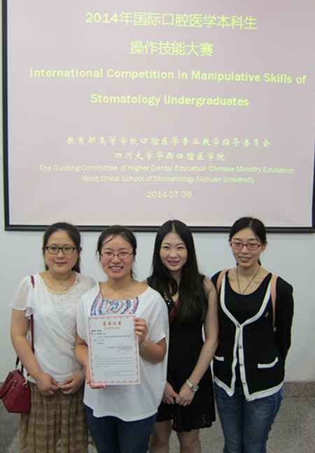 7月9日,由教育部高等学校口腔医学专业教学指导委员会主办,四川大学华西口腔医学院承办的2014年国际口腔医学本科生操作技能大赛在四川成都隆重举行。大赛共有来自中国、荷兰、美国、日本等46所国内外高等院校的近120名口腔医学大学本科生参加。本次技能大赛包含六项基本操作技能,涉及心肺复苏、手卫生、绷带包扎、显微缝合、手部技能和牙体外形绘图等多方面操作技术。我院受邀并选派四名七年制本科生潘雅慧、王毓佳、曹阳、邵娇娇组成代表队参加了此次比赛,经过激烈角逐,最终以优异的成绩荣获大赛三等奖。