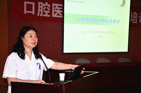 王磊书记、周楠副书记讲授医德医风教育内容,着重强调了良好的医风医德和和谐医患关系的重要性,要求每一位医务工作者要用微笑与热忱和病人沟通,成为一名专心的倾听者、细心的观察者、敏锐的交谈者和有效的诊治者,把“以人为本、以病人为中心”的服务理念落实到行动上。王文梅副院长针对口腔医院“大门诊、小病房”,门诊病人多、诊疗环节多等特点,对新员工提出做好医疗工作的总体要求,强调不仅要具备精湛的医疗技术,还要平等对待不同患者,要有爱心、耐心和责任心。孙卫斌副院长向新员工介绍了医院的发展历程、现状,医院文化建设以及依托南京大学平台、走国际化发展之路的美好未来。相关职能科室负责人对规章制度、岗位要求以及专业知识等进行培训。