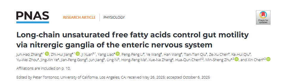 研究工作以“Long-chain unsaturated free fatty acids control gut motility via nitrergic ganglia of enteric nervous system”为题于20251111日在学术期刊PNAS上发表。南京大学医学院博士张军浩、蒋志慧,附属金陵医院宣佶为本文共同第一作者,南京大学医学院陈鑫、朱敏生和南京师范大学生命科学学院陈华群教授为共同通讯作者,此项工作也得到来自南京医科大学、南京中医药大学和江南大学等单位研究者的支持,研究经费由国家自然科学基金、江苏省自然科学基金和国家重点研发计划提供。