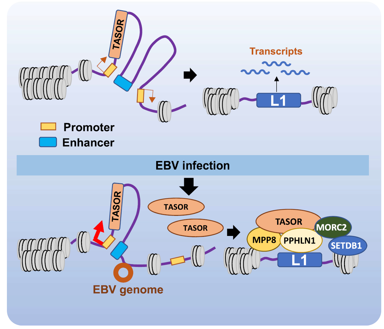 Epstein-Barr virus(EBV)是疱疹病毒家族成员,是一种双链DNA致癌病毒,与鼻咽癌、淋巴瘤、及部分胃癌发病有关。EBVaGC是一种具有独特分子特征的临床胃癌亚型,占胃癌病例的10%左右,然而EBV感染在该亚型胃癌发生发展中的作用仍不清楚。南京大学医学院何素素/李尔广团队以EBVaGC作为模型,研究了EBV感染对长散布元件LINE-1转座子表达的影响,发现EBVaGC中病毒基因组黏附于宿主HUSH复合物核心蛋白TASOR基因编码区域,导致TASOR增强子和启动子之间相互作用增强,导致TASOR高表达,进而促进HUSH复合物形成,在内含子区年轻全长LINE-1上沉积,抑制LINE-1转座子表达。人类基因组中将近50%的序列为转座子,其中LINE-1转座子占比最高,也是人类基因组中唯一具有自主转座活性的转座子,经由转录-逆转录完成转座周期,可破坏或影响插入位点基因结构和表达,在肿瘤细胞中常出现LINE-1表达失调或异常转座事件,因此可能与肿瘤发生发展有关。课题组从病毒与宿主基因组相互作用的角度阐述了LINE-1表达与EBV相关胃癌(EBVaGC)的关系,为研究病毒感染与癌症等疾病的发生发展提供了新的思路和研究方向。