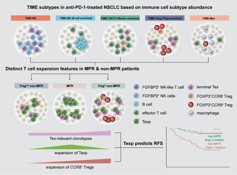 该研究依据每例患者肿瘤中不同免疫细胞亚型的相对丰度对患者进行聚类,识别了新辅助免疫治疗后的5类免疫微环境亚型(TIME-subtypes),包含富集FGFBP2+ NK细胞的高响应性亚型(TIME-NK)、富集B细胞与三级淋巴结构的高响应性亚型(TIME-BE)、富集效应T细胞的高响应性亚型(TIME-Teff)、富集Treg与终末耗竭T细胞的低响应性亚型(TIME-Treg)及富集髓系细胞的低响应性亚型(TIME-Mye)。值得注意的是,non-MPR患者中有近半数表现为TIME-Treg亚型,提示了Treg富集与低缓解率的相关性。