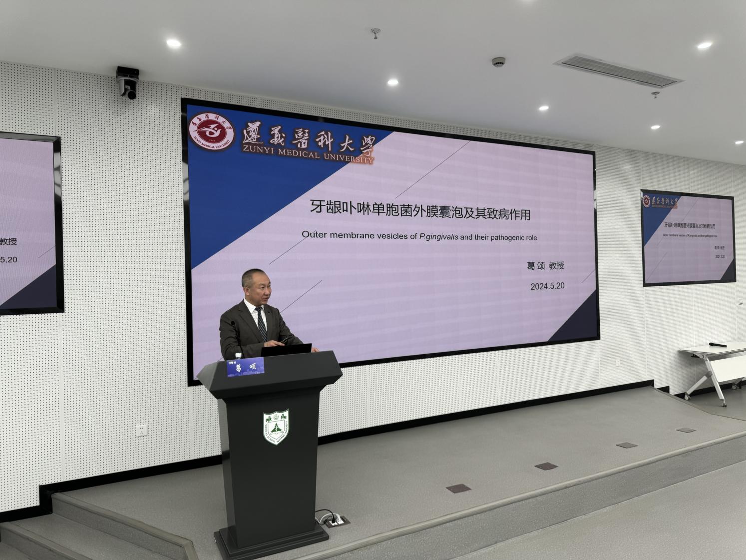 遵义医科大学口腔医学院院长葛颂教授的讲授围绕“牙龈卟啉单胞菌外膜囊泡及其致病作用”展开。葛教授深入浅出地解释了复杂的医学研究课题,毫无保留地将自己最新的研究成果和研究启示与师生们进行分享。