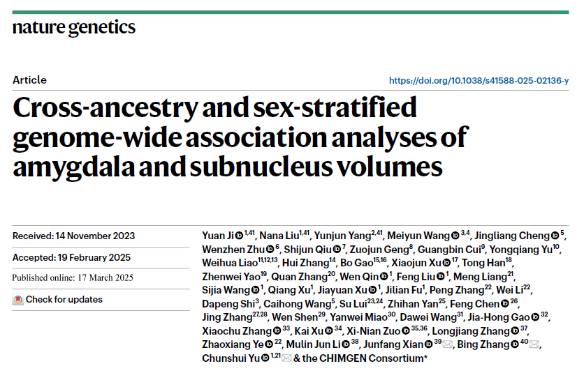 2025年3月17日,Nature Genetics在线发表了南京大学医学院张冰教授,首都医科大学附属北京同仁医院鲜军舫教授,和天津医科大学总医院于春水教授团队合作的研究论文,题为“Cross-ancestry and sex-stratified genome-wide association analyses of amygdala and subnucleus volumes”。该研究首次系统性解析了杏仁核及其亚核体积的跨祖先、跨性别遗传异质性,为杏仁核相关神经-精神疾病的精准诊疗提供了新见解。