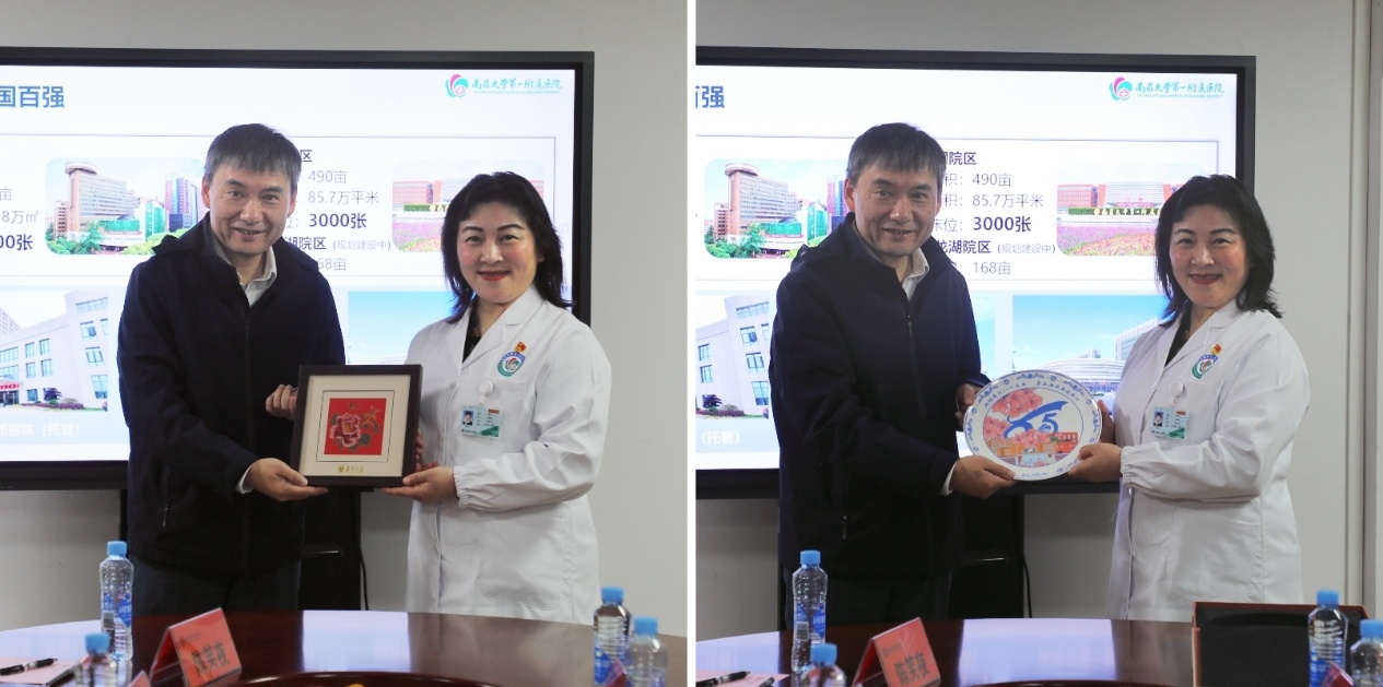 在南昌大学第一附属医院,沈苏南一行受到了医院党委书记廖岚等院领导的热情接待,双方随即展开了深入的座谈交流。会上,廖岚介绍了医院的发展历程、科研实力、教育教学等方面。她指出,南昌大学第一附属医院是集医疗、教学、科研、预防保健、健康管理与促进于一体的全国首批三级甲等医院,高素质医学人才是推动医院实现高质量发展的核心动能,希望以此次交流为契机,与南京大学医学院深化长期合作关系。随后,我方介绍了学院的基本情况、学科专业,以及在人才培养、科学研究和社会服务等方面的成果和经验。最后,双方就如何深化院校合作、加强实践教学、拓展学生就业渠道等方面进行了深入交流和探讨。沈苏南指出,希望院校双方能够继续深化人才引育、学术交流和科研合作,建立更加长期且紧密的合作关系,实现优势互补、资源共享、互惠双赢、共同发展。