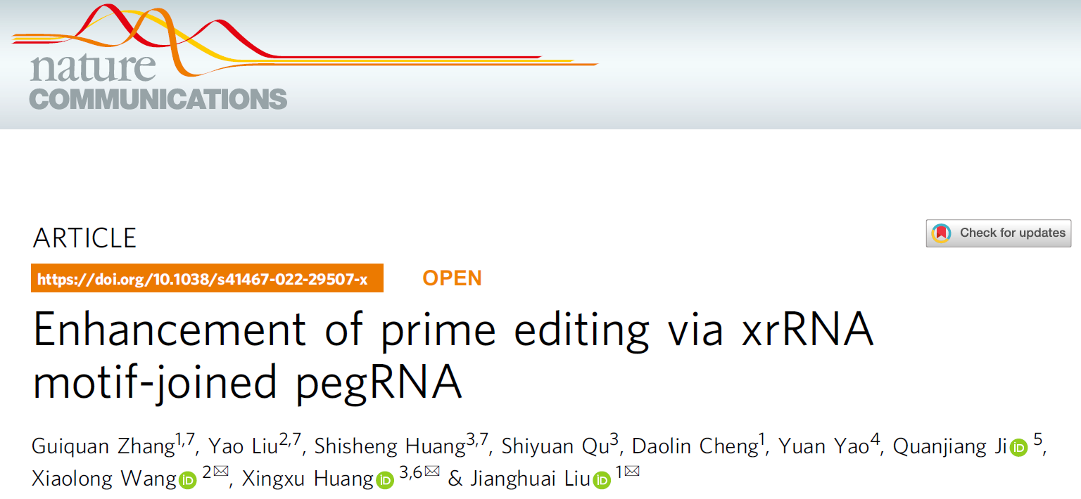 2022年04月06日,这篇题为“Enhancement of prime editing via xrRNA motif-joined pegRNA”的论文发表于《自然-通讯》杂志(Nature Communications)。该工作的第一作者(共同)为医学院模式所博士生张贵泉、刘尧(西北农林科技大学)和黄诗圣(上海科技大学);通讯作者分别为刘江怀、黄行许(上科大)与王小龙(西农)教授。研究工作受到科技部重点研发计划等项目的资助。