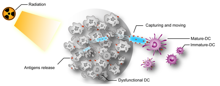 尝试利用自身免疫系统攻击肿瘤细胞是一种最理想的抗肿瘤治疗方式。肿瘤接受了放疗以后,会释放出一系列的抗原。理想状态下,这些抗原可以直接作为抗肿瘤原位疫苗,激活树突状细胞(DC),然后将抗原呈递给CD4+T或者CD8+T细胞,从而启动免疫反应。