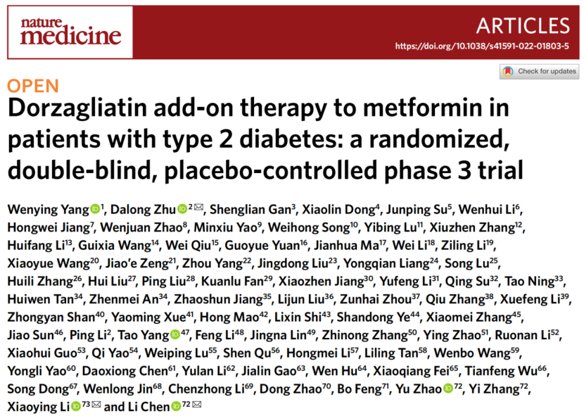 2022年5月12日,南京大学医学院附属鼓楼医院朱大龙教授团队在Nature Medicine杂志同时在线发表了两篇论文:“Dorzagliatin in drug-naïve patients with type 2 diabetes: a randomized, double-blind, placebo-controlled phase 3 trial”和“Dorzagliatin add-on therapy to metformin in patients with type 2 diabetes: a randomized, double-blind, placebo-controlled phase 3 trial”。文章报道了全球首创糖尿病新药葡萄糖激酶激活剂(GKA)多格列艾汀(dorzagliatin)的III期注册临床研究结果。两篇论文分别详细展示和描述了多格列艾汀单药(SEED研究)用于治疗新诊断未用药2型糖尿病患者,以及多格列艾汀联合二甲双胍(DAWN研究)用于治疗二甲双胍足量治疗失效2型糖尿病患者的临床疗效和安全特征。