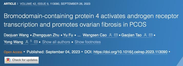 2023年9月4日,南京大学医学院王勇教授、曹望森教授团队在Cell Reports杂志发表了题为“Bromodomain-containing protein 4 activates androgen receptor transcription and promotes ovarian fibrosis in PCOS”的论文,该研究揭示了乙酰化“阅读”蛋白BRD4促进AR转录活化是PCOS卵巢纤维化的重要表观遗传学旁路。南京大学医学院王勇教授、曹望森教授和附属鼓楼医院陶高见主任为本论文的共同通讯作者,南京大学医学院博士研究生王道娟为本论文的第一作者。本研究得到了国家自然科学基金(#82201795,81971346)的资助。王道娟博士为本研究的第一作者。