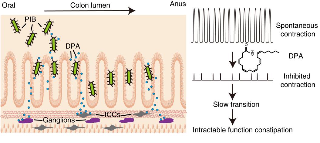 图1.PIB菌经口腔进入机体,定植于结肠粘膜,产生二十二碳五烯酸(DPA)抑制结肠蠕动,最终导致顽固性功能性便秘。