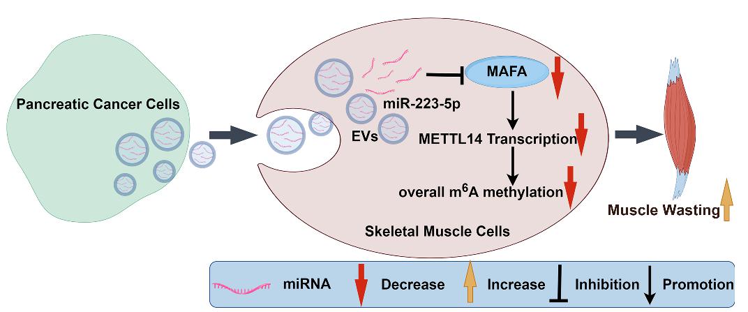 这项研究首次从器官间互作视角为胰腺癌相关骨骼肌减少的机制进行解析,证明了胰腺肿瘤细胞来源的细胞外囊泡(EVs)是PDAC肌肉消耗的关键因素,miR-223-5pEVs介导PDAC肌肉消耗的关键效应分子,具有跨组织调控能力,可通过抑制MAFA/METTL14轴,导致骨骼肌m6A甲基化减少和肌肉萎缩。该研究为开发胰腺癌肌少症的精准诊断方法和靶向治疗策略奠定了坚实的理论基础。