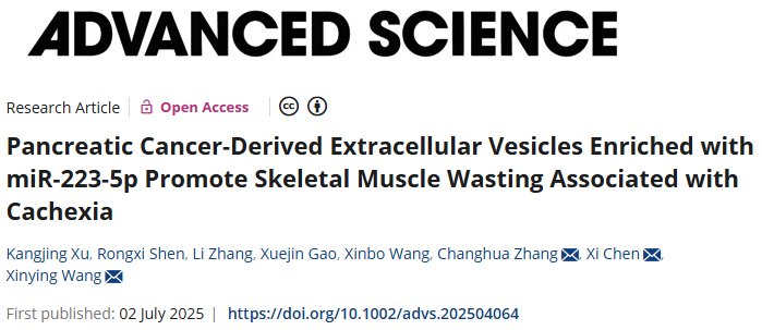 202572日,南京大学医学院附属金陵医院王新颖教授团队、南京大学生命科学院陈熹教授团队和中山大学附属第七医院张常华教授团队合作,在《Advanced Science》在线发表了题为“Pancreatic Cancer-Derived Extracellular Vesicles Enriched with miR-223-5p Promote Skeletal Muscle Wasting Associated with Cachexia”的研究成果。这项研究首次揭示胰腺肿瘤细胞通过释放细胞外囊泡实现与骨骼肌的远程通讯,驱动PDAC患者肌肉消耗;并发现循环EVs中的miR-223-5p是该过程的关键效应分子和潜在诊断标志物,为开发胰腺癌肌少症的精准诊断方法和靶向治疗策略奠定了坚实的理论基础。南京大学医学院博士研究生徐康菁为本文的第一作者。南京大学医学院附属金陵医院王新颖教授为本文的最后通讯作者。该项研究得到了国家自然科学基金委、科技部、江苏省科技厅以及中央高校等基金的支持,并在相关研究方面得到合作实验室的大力协助与支持。