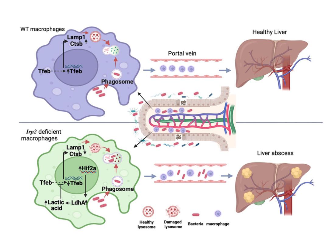 南京大学医学院李宽钰教授课题组和附属鼓楼医院病理科樊智文副研究员合作,利用葡聚糖硫酸钠盐(DSS)造肠炎模型后,意外发现Irp2缺失小鼠有肝脓肿表型。为了探究IRP2在保护机体免受肠源性感染造成肝脓肿中的作用及其机制,研究人员首先给予Irp2全身敲除和髓系细胞Irp2敲除小鼠间隔DSS饮水构建肠道屏障损伤后,发现Irp2缺失后不影响中性粒细胞载菌量变化,只增加巨噬细胞载菌量,同时发现Irp2缺失并不影响巨噬细胞的吞噬功能和溶酶体递送功能,但显著影响溶酶体的生物合成和酸化能力。进一步机制研究发现Irp2缺失上调Hif2a表达,引起乳酸脱氢酶的活性和乳酸水平增加,促进转录因子TFEB的磷酸化,导致TFEB不能正常入核,溶酶体生物合成减少,酸化能力下降,降低了巨噬细胞清除细菌的能力。因此,Irp2缺失后,病原菌有机会从受损的肠屏障进入门静脉,不断侵袭和易位进入肝脏,促进肝脓肿的发生发展。
