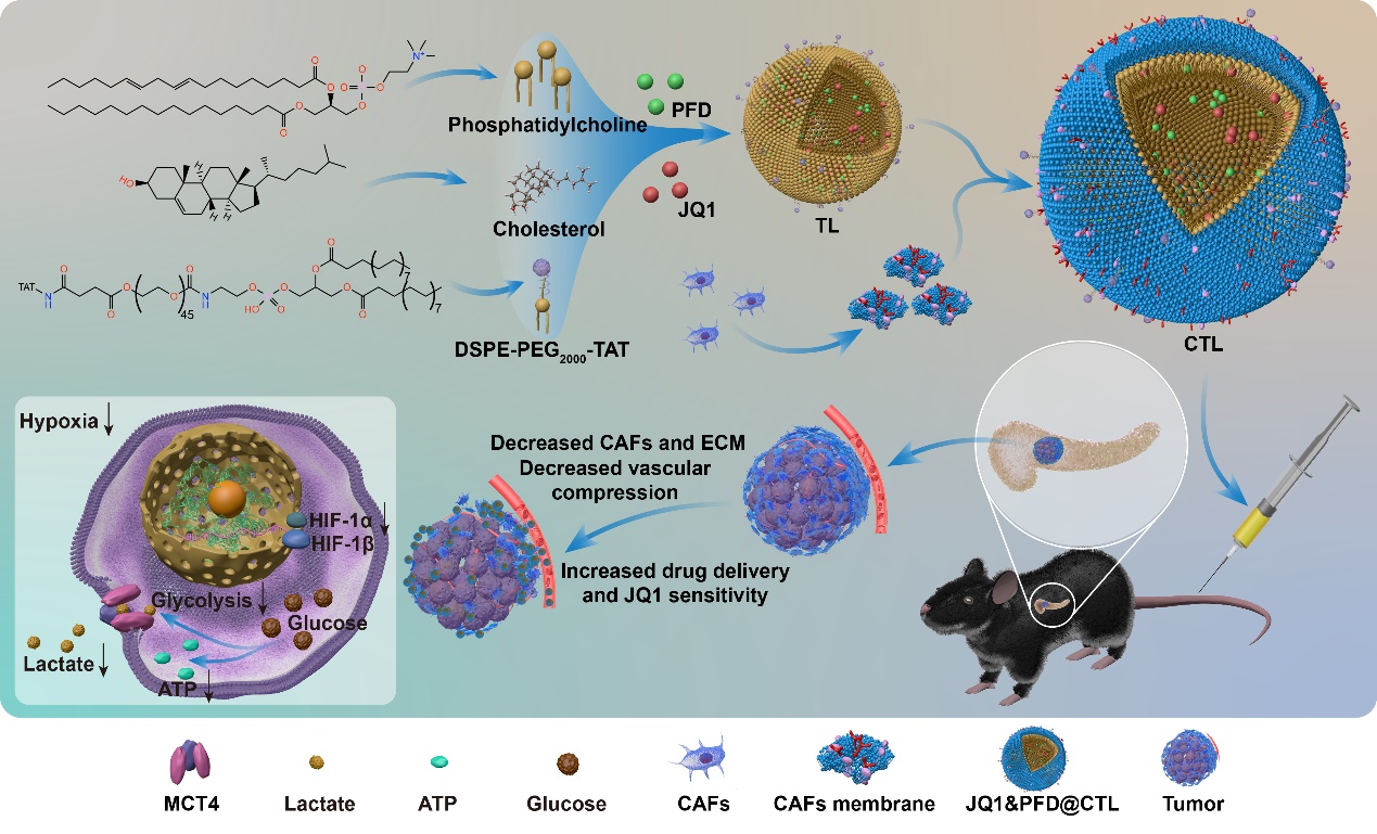 综上,针对CAFs在胰腺癌中的作用机制,研究人员设计了一种主动靶向富含CAFs的胰腺癌的特洛伊木马系统,通过PFD减少肿瘤微环境中细胞外基质的产生,进一步暴露胰腺肿瘤,增加后续的药物灌注。并且PFD通过调节CAFs对BRD4的影响增强了癌细胞对JQ1的敏感性。转录组测序表明PFD治疗改善了肿瘤组织的缺氧环境,并下调了糖酵解的关键酶和产物,导致肿瘤的能量代谢障碍。本研究中提出的策略将抗纤维化药物和化疗药物整合在纳米载体中,通过增强药物渗透和提高化疗疗效,作为一种有前途的药物递送机制来增强耐药肿瘤的治疗。