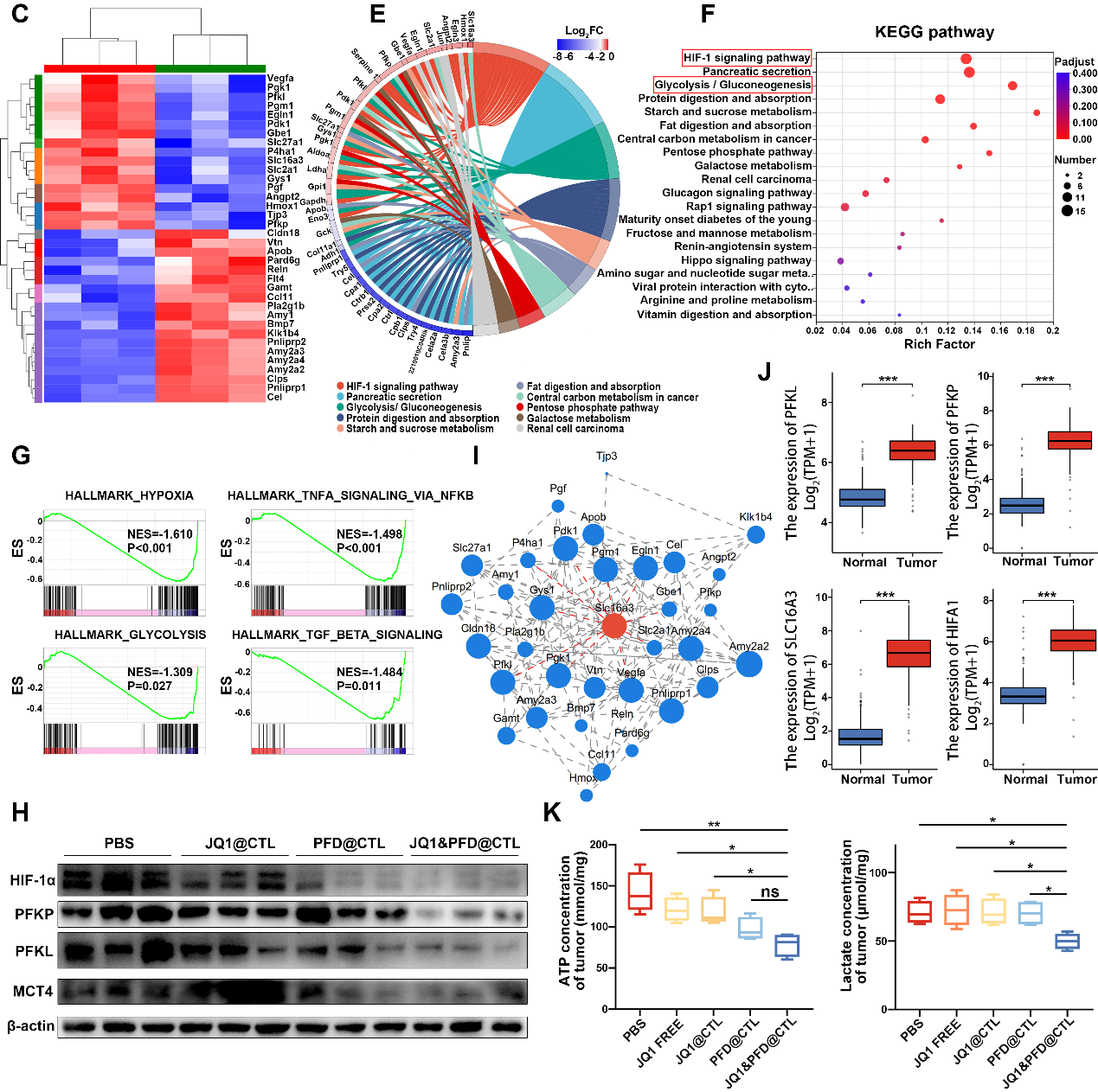 研究人员为了阐明PFD对胰腺癌的抗癌作用机制,对JQ1&PFD@CTL和JQ1@CTL治疗组的肿瘤组织进行了转录组测序。KEGG富集分析研究差异表达基因,发现其主要富集在HIF-1信号通路和糖酵解信号通路,并且观察到在JQ1&PFD@CTL治疗组糖酵解关键酶的下降和乳酸及ATP水平的降低,表明肿瘤组织主要的能量代谢途径被抑制。