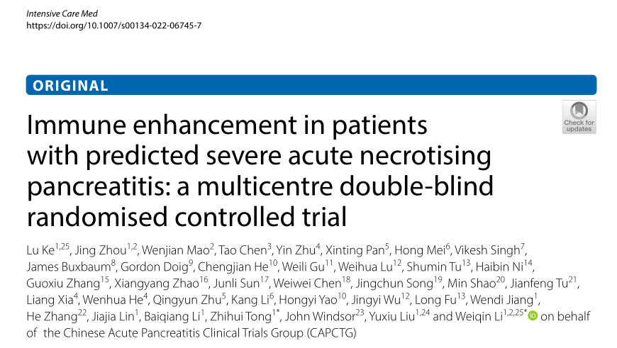 上述研究成果“Immune enhancement in patients with predicted severe acute necrotising pancreatitis: a multicentre double-blind randomised controlled trial”于2022年6月17日发表于重症TOP期刊《Intensive Care Medicine》,南京大学医学院附属金陵医院为论文的唯一通讯单位,柯路副教授、周晶博士、毛文健博士研究生为共同第一作者,童智慧副教授、李维勤教授为共同通讯作者。