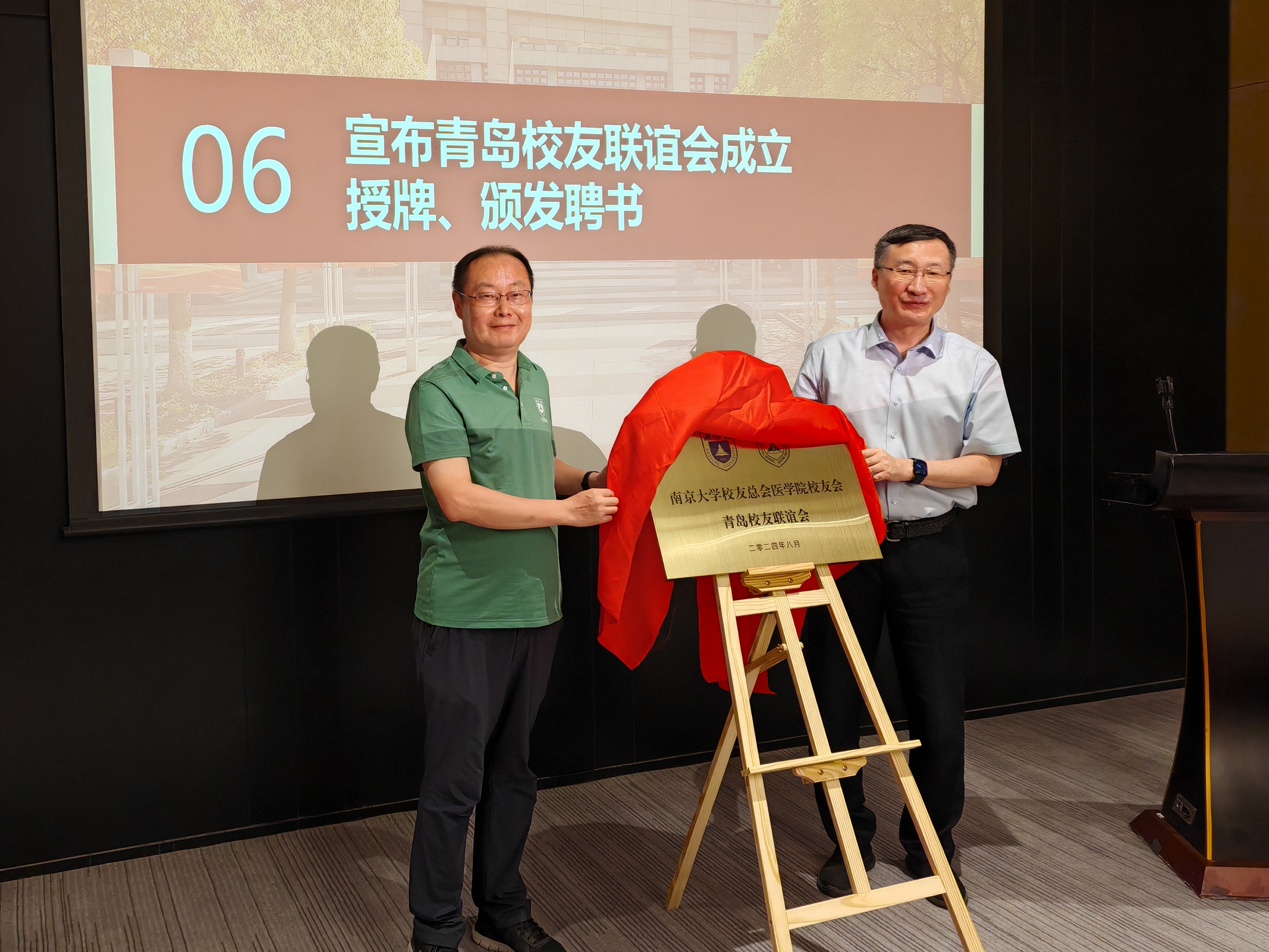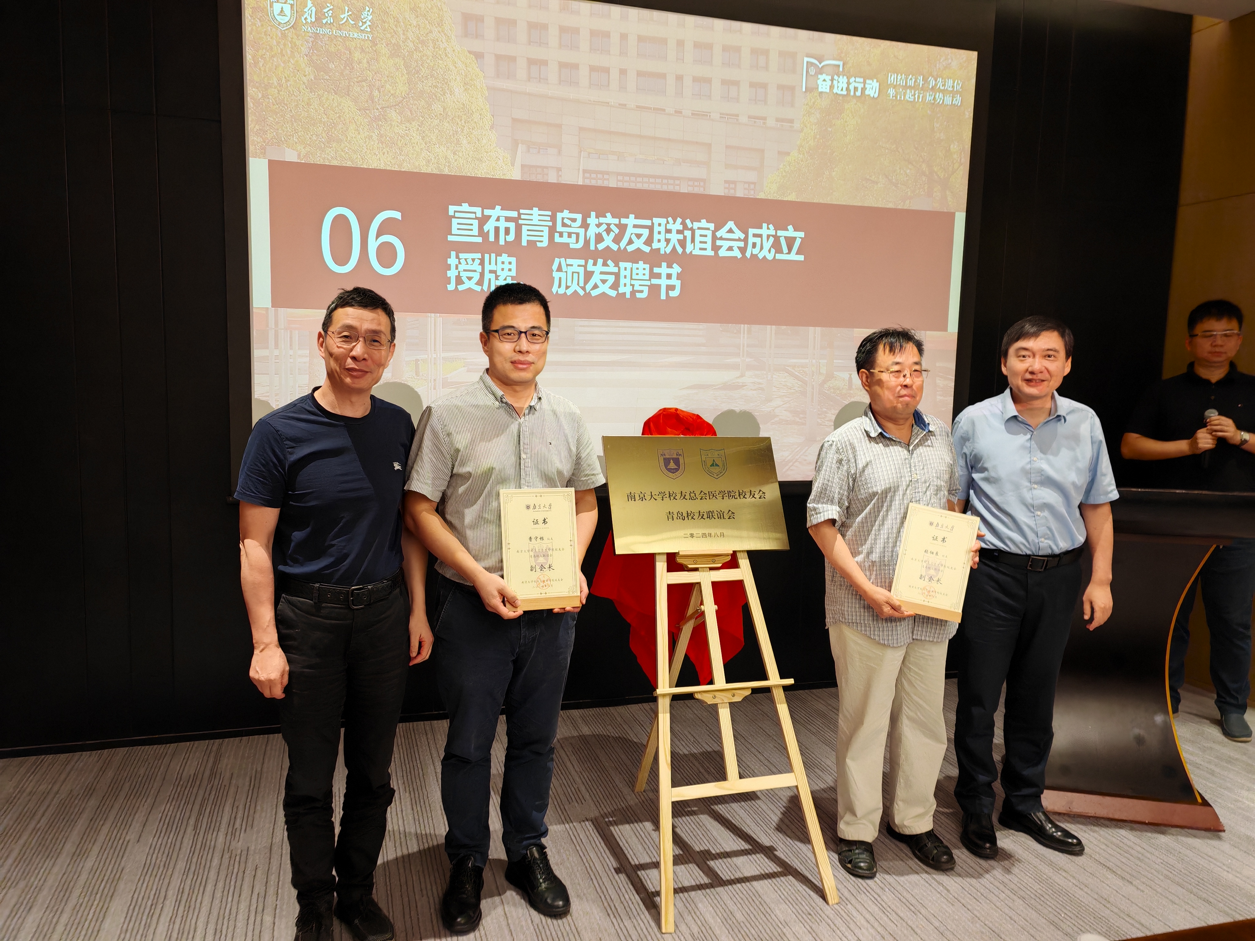 8月31日下午,南京大学校友总会医学院校友会青岛校友联谊会成立大会在青岛举行。中国海洋大学校长、南京大学校友总会医学院校友会会长张峻峰,南京大学校友事务与发展工作处处长、校友总会秘书长冯帆,南京大学医学院党委书记沈苏南,原党委书记韩晓冬,党委副书记、副院长蒋青,党委副书记王阿妮,副院长王婷婷,副院长吴锦慧,南京大学国际医健校友会会长、医学院校友会名誉理事陈一青等出席会议。南京大学青岛校友会代表到会祝贺。大会由校友闫鹏主持。
