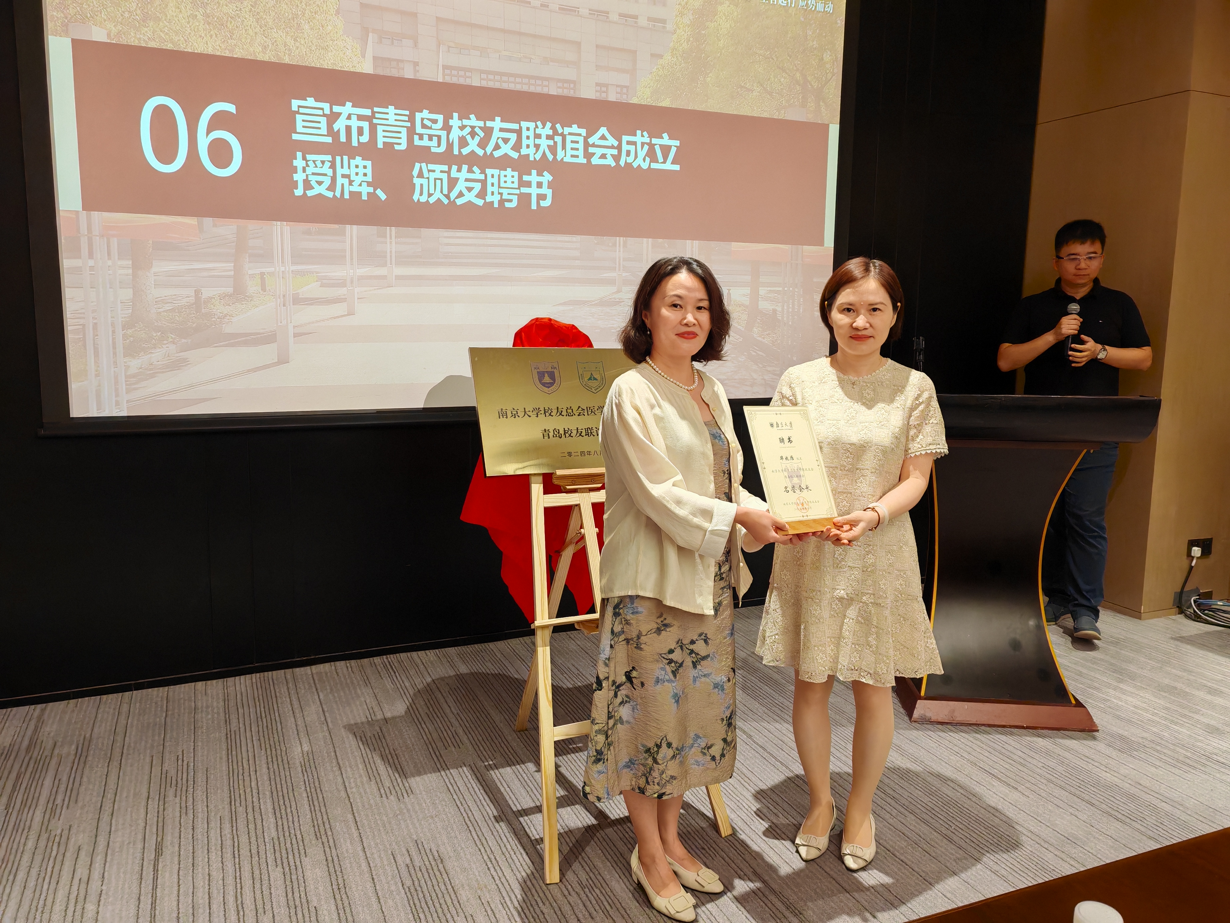 会上举行了医学院校友会青岛联谊会授牌仪式,并向会长、副会长等颁发聘书。