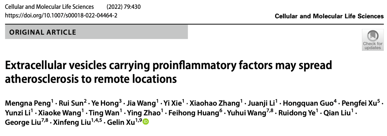 上述研究成果“Extracellular vesicles carrying proinflammatory factors may spread atherosclerosis to remote locations”于2022年7月18日在线发表于综合性期刊《Cellular and Molecular Life Sciences》。南京大学医学院彭蒙娜博士等为该研究论文的第一作者,徐格林教授、刘新峰教授为共同通讯作者。该研究与北京大学心血管研究所刘国庆教授、王宇辉副研究员合作完成。感谢国家自然科学基金对本研究的资助。