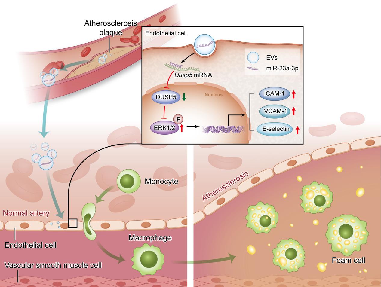 南京大学医学院附属金陵医院徐格林/刘新峰教授团队利用Ldlr KO大鼠建立颈动脉粥样硬化模型,提取动脉粥样硬化血管组织及流经颈动脉的血液中的外泌体,发现动脉粥样硬化来源的外泌体可以促进内皮细胞炎性反应。通过miRNA测序和q-PCR验证,发现miR-23a-3p高表达于动脉粥样硬化来源的外泌体中,并且能够分泌入血。体外实验证实miR-23a-3p可以通过靶向Dusp5 mRNA,激活MAPK通路,进而促进内皮细胞炎症。将动脉粥样硬化来源的外泌体打入大鼠循环中,可以观察到颈动脉内膜炎症反应上调,并且观察到颈动脉管壁增厚及管腔狭窄,抑制miR-23a-3p可以抑制外泌体介导的炎性反应及血管重构。该成果阐述了外泌体通过促进血管炎症反应,进而介导动脉粥样化硬化远隔部位转移的可能性,为动脉粥样硬化全身泛化的机制提供了新思路。