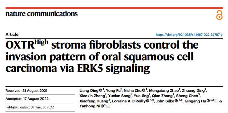 2022年8月31日,南京大学医学院附属口腔医院泥艳红、胡勤刚团队在口腔鳞癌(OSCC)复发的机制方面取得重要进展,发现了一种新的调控肿瘤浸润方式的成纤维细胞亚群,并提出了通过靶向此亚群来改变肿瘤浸润方式的策略,为减少肿瘤患者转移和复发肿瘤提供了新的治疗思路。该研究成果“OXTRHigh stroma fibroblasts control the Invasion Pattern of Oral Squamous Cell Carcinoma via ERK5 Signaling”以研究长文形式在线发表于《Nature Communications》。南京大学医学院附属口腔医院丁亮副研究员为文章第一作者,南京大学医学院附属口腔医院中心实验室泥艳红主任和胡勤刚教授为文章通讯作者。该项研究工作得到南京大学医学院附属口腔医院口腔颌面外科、病理科、检验科、口腔疾病生物样本库的大力支持,同时得到中国博士后基金、国家自然科学青年基金、江苏省自然科学基金、省部共建临床医学中心等项目的资助。