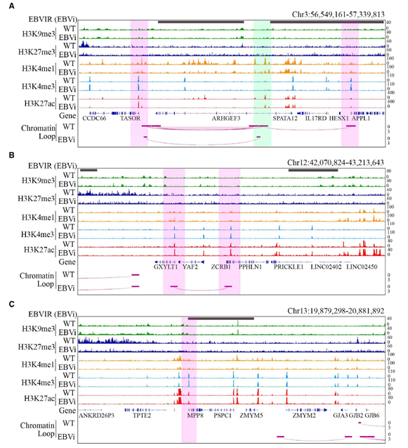 Theynext found that TASOR is upregulated in EBVaGC. The upregulation mechanism is revealed by analyzing the 4C- and HiC-seq data which indicated that the viral DNA interacted in the proximity to TASOR enhancer, strengthening the loop formation between the TASOR enhancer and its promoter (Figure 3).