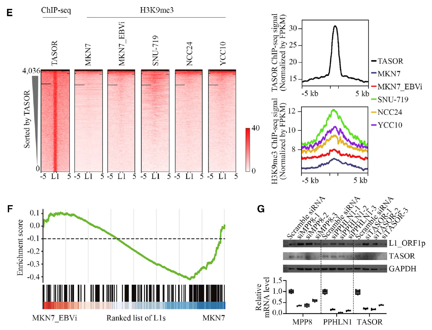 The researchers further analyzed the epigenetic modifications on these L1s and found an increased H3K9me3 modification on FL-L1s in EBVaGC cells. Especially, the TASOR-bound L1 subgroup exhibited with significantly increased H3K9me3 signal (Figure 2). These results indicated that TASOR, the core component of human silencing hub (HUSH) complex, is responsible for L1 silencing in EBVaGC.